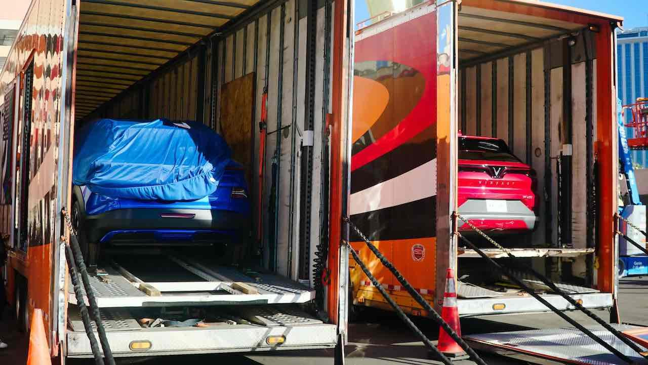 Rạng sáng ngày 4/1 (giờ Việt Nam), tại Trung tâm Triển lãm và Hội nghị Las Vegas (Nevada, Mỹ), dàn xe containter cỡ lớn mang theo những chiếc xe điện VinFast chính thức xuất hiện thu hút sự chú ý của những người có mặt.