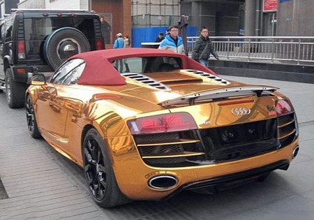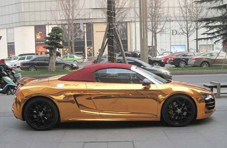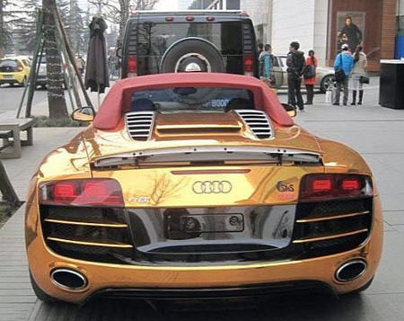 Mới đây, một chiếc Audi R8 Spyder mạ vàng hồng (rose gold) sáng lấp lánh được bắt gặp trên đường phố Trung Quốc. Có thể thấy lớp vỏ xe được thay thế gần như hoàn toàn, từ phần đầu xe tới vỏ cánh gió phía sau xe.