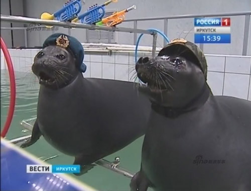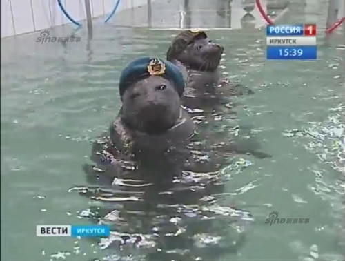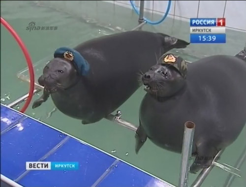 Hai chú hải cẩu đội mũ đồng phục của binh lính Nga.