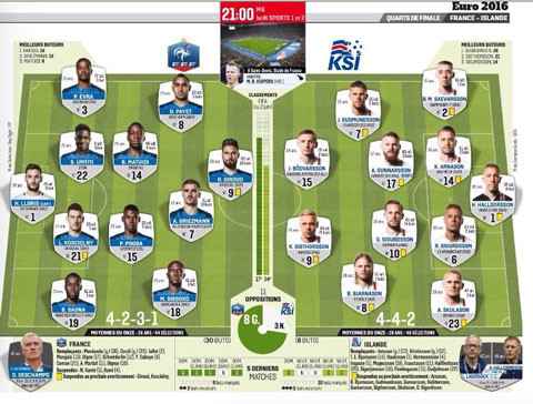 Tuy chưa đến thời điểm công bố nhưng đội hình xuất phát của Pháp và Iceland ở trận tứ kết EURO 2016 diễn ra vào rạng sáng mai đã được tờ nhật báo thể thao uy tín L'Equipe tiết lộ.