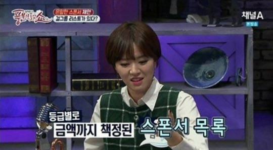 Trong một số gần đây của chương trình “Heard It Through the Grapevine” trên kênh Channel A, phóng viên Kim Myo Sung đã tiết lộ một sự thật gây sốc đằng sau ánh hào quang của showbiz Hàn: nhiều nữ nghệ sĩ đang tìm kiếm các “nhà tài trợ” - những đại gia giàu có và thế lực không ngại bỏ ra số tiền lớn và dùng ảnh hưởng của mình để giúp các người đẹp phát triển sự nghiệp. Đổi lại, họ sẽ được “trả” bằng tình dục.