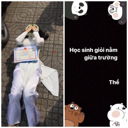 Theo đó, cô bạn mặc áo dài trắng, đầu đội "vòng nguyệt quế" và vinh dự cầm trên tay tờ giấy khen ghi hàng chữ "Học sinh Giỏi". Thay vì tạo dáng duyên dáng để chụp ảnh thì cô bạn đành phải nằm giữa sân trường, bởi trước đó trót dại thề thốt.