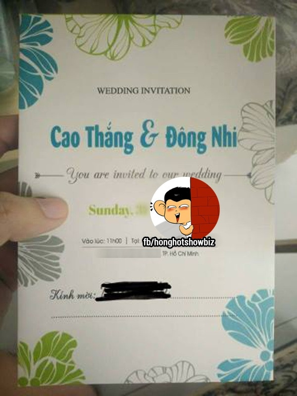Mới đây, trên một Fanpage đăng tải hình ảnh được cho là thiệp cưới của cặp đôi Đông Nhi – Ông Cao Thắng khiến nhiều người bất ngờ. Cụ thể, trên tấm thiệp ghi rõ là thiệp mời cưới có tên của hai ca sĩ. Theo tấm thiệp này, thời gian cưới sẽ diễn ra vào 11h ngày Chủ nhật tại TP.HCM. Tuy nhiên, tháng năm và địa điểm cụ thể đều đã được che đi một cách khéo léo.