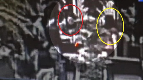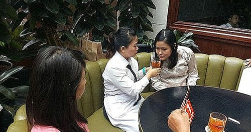 Wongso (mặc áo màu cam) đứng cạnh Mirna (đeo túi chéo) trước khi cả ba cùng ngồi xuống. Mirna ngồi xuống trước, sau đó uống cốc cà phê tẩm độc xyanua và ngửa đầu ra sau bất tỉnh.