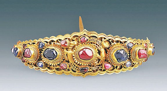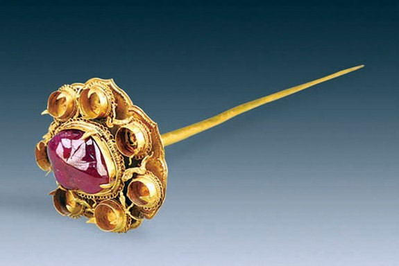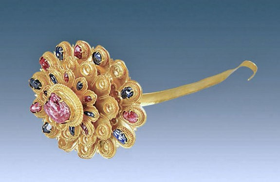 Chiếc trâm cài tóc này vô cùng giá trị khi chế tác từ vàng và nổi bật với những viên sapphire và hồng ngọc. Cổ vật này nặng 148,7 gram.