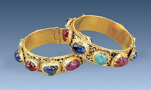 Cận cảnh hai chiếc vòng tay được chế tác vô cùng tinh xảo, có đường kính khoảng 7 cm. Những chiếc vòng tay bằng vàng này được kết hợp với một số loại đá quý gồm ngọc bích, hồng ngọc và ngọc lam.
