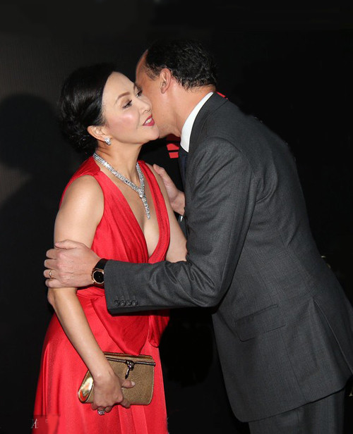 Bà xã Lương Triều Vỹ phối nữ trang kim cương khi diện váy đỏ xẻ ngực sâu. Theo Mingpao, bộ trang sức kim cương của Lưu Gia Linh trị giá 30 triệu HKD (tương đương 3,9 triệu USD).