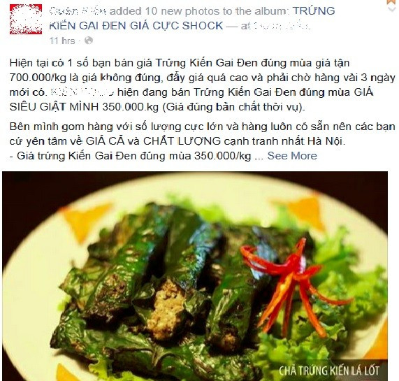 Địa chỉ này đã có nhiều năm mua gom hàng và bán ra số lượng lớn trên toàn quốc. Giá trứng kiến gai đen được bán tại đây ở mức 350.000 đồng/kg. Tuy nhiên, tới đầu tháng 5, khi hết vụ, giá có thể tăng tới khoảng 600.000 đồng/kg.