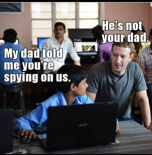 Bức hình chế này xuất hiện từ khi vụ bê bối dữ liệu của Facebook nổ ra và tiếp tục được lan truyền trong hai ngày nay khi Mark Zuckerberg tham gia phiên điều trần trước Quốc hội Mỹ. Trong ảnh, cậu bé nói với Zuckerberg: "Bố tôi nói rằng ông đang theo dõi chúng tôi". Và ông chủ Facebook đáp lại: "Ông ta không phải là bố của cậu".