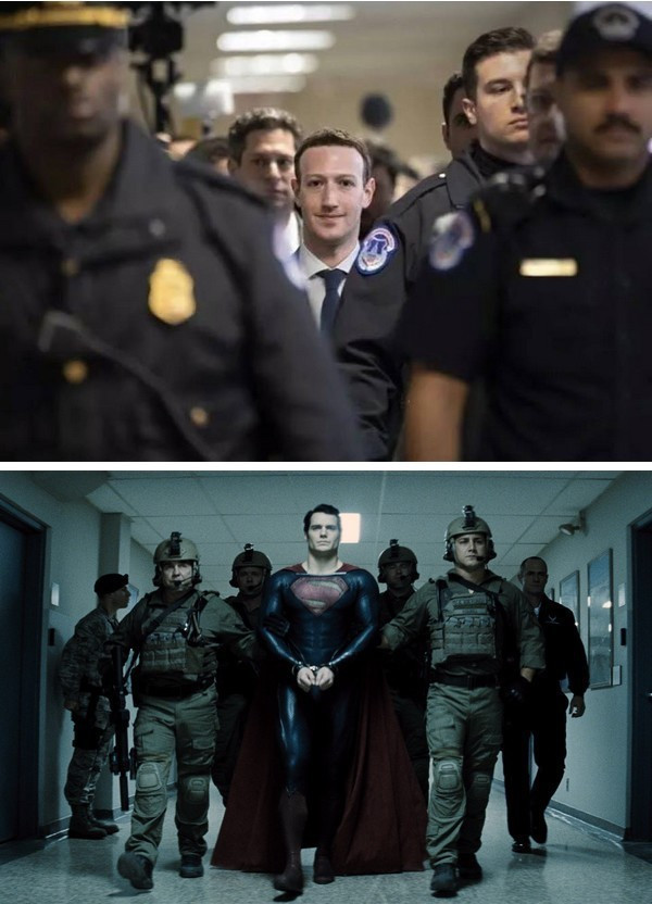 Hình ảnh CEO Facebook Mark Zuckerberg tươi cười và tự tin bước vào tòa nhà Quốc hội Mỹ dưới sự bảo vệ của lực lượng vũ trang, khiến nhiều người nhớ đến hình ảnh nhân vật Superman bị bắt giữ và hộ tống. Sự tự tin của nhân vật chính trong cả hai bức hình có một sự tương quan "không hề nhỏ".