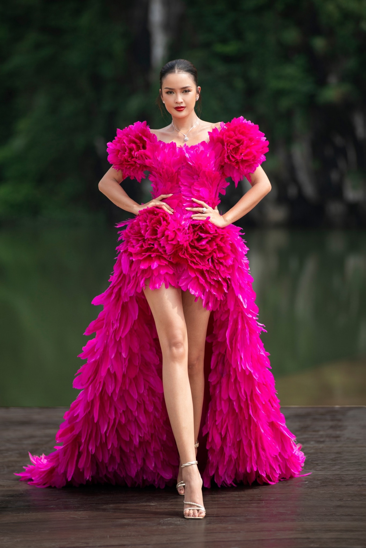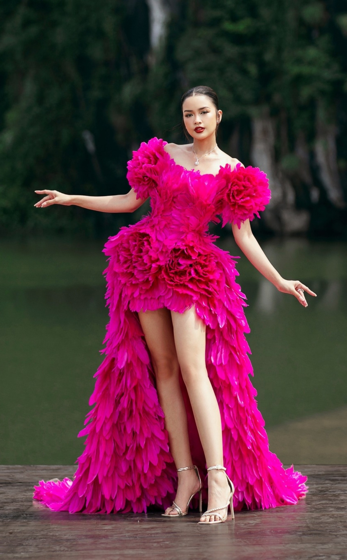 Thiết kế mang gam màu hồng đậm thực sự rất kén người mặc, nhưng đều được cả hai nàng hậu “cân đẹp”. Hoa hậu Thanh Thủy mang đến hình ảnh của loài chim thiên nga với bộ lông được nhuộm hồng rực rỡ.