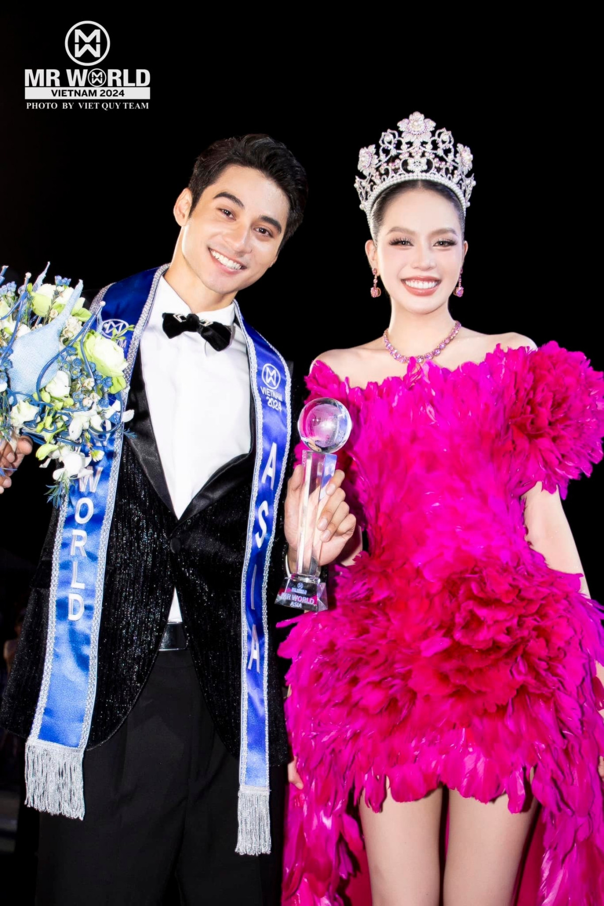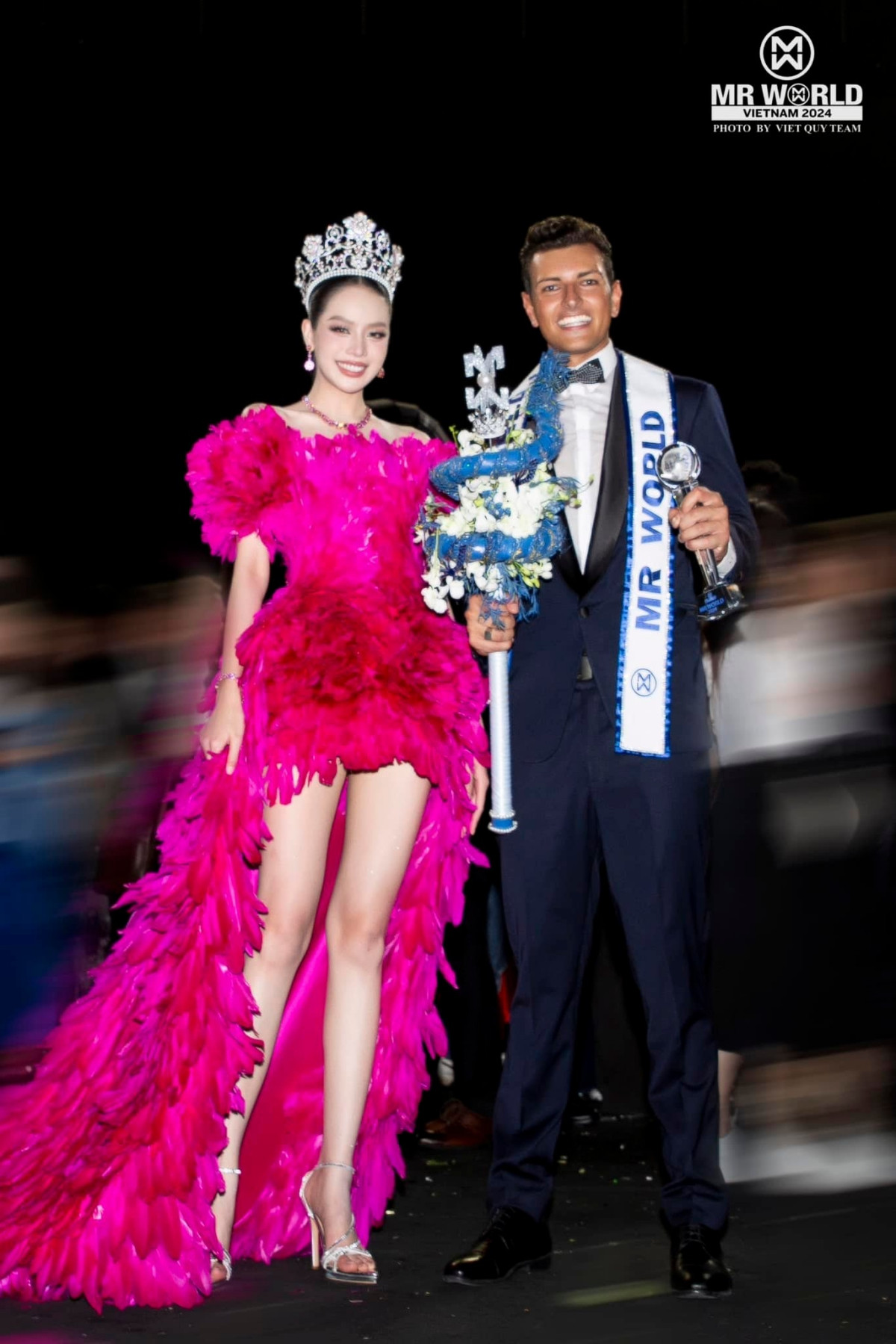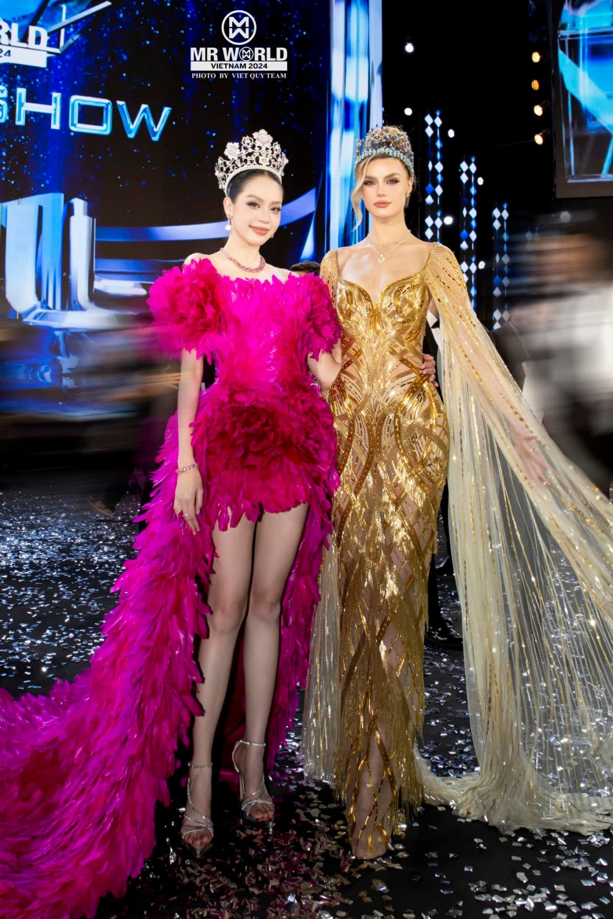 Miss International 2024 Huỳnh Thị Thanh Thủy bên cạnh tân Mr World 2024 Danny Mejía Romero và đương kim Miss World 2024 Krystyna Pyszková.