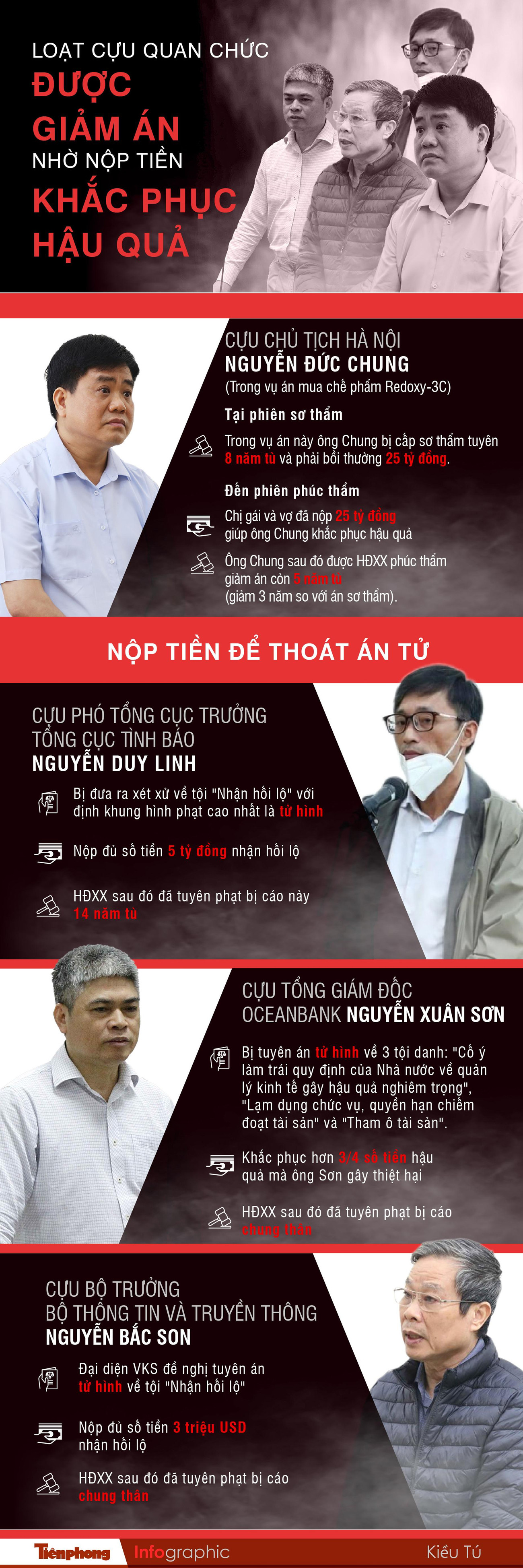 TPO - Trong vụ án mua chế phẩm Redoxy-3C, cựu Chủ tịch Hà Nội Nguyễn Đức Chung được giảm 3 năm so với bản án sơ thẩm nhờ việc người nhà nộp tiền khắc phục hậu quả. Trước đó, cũng có nhiều cựu quan chức được giảm án thậm chí thoát án tử nhờ nộp tiền khắc phục hậu quả.