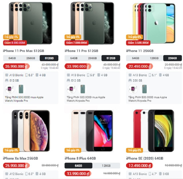 iPhone SE 2020 phiên bản 64 GB được giảm giá từ 12,99 triệu đồng xuống 11,99 triệu đồng. Phiên bản 128 GB giảm 2,5 triệu đồng, xuống còn 12,49 triệu đồng. Người mua phiên bản 256 GB được giảm từ 17,99 triệu đồng xuống 16,99 triệu đồng.