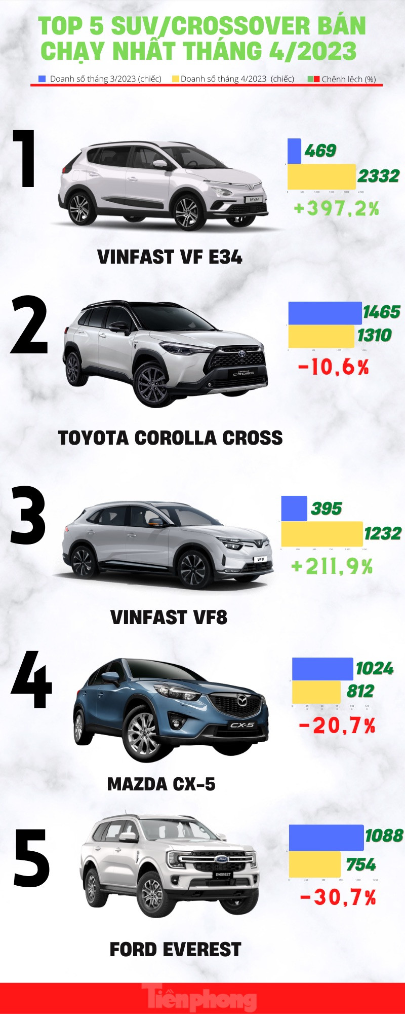 TPO - Trong tháng 4 vừa qua, ngoài hai mẫu EV VinFast VF e34 và VinFast VF 8 có doanh số tăng đột biến do nhu cầu đẩy mạnh các hãng taxi điện, lượng hàng bán ra của các sản phẩm còn lại đều giảm.