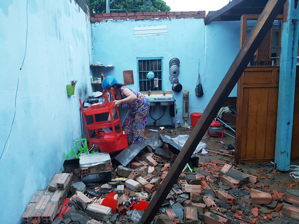 Các thành viên trong gia đình ông Toán chưa kịp phản ứng thì tường, xà gồ từ trên cao rơi xuống làm 4 người bị thương ở đầu, lưng và chân, được đưa vào bệnh viện. Vợ ông Toán bị thương nặng ở đầu gối, còn người cháu bị toác đầu.