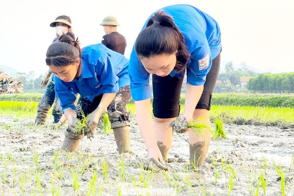 | “Áo xanh” không quản ngại bùn đất lầy lội, nhiệt tình cấy lúa. |