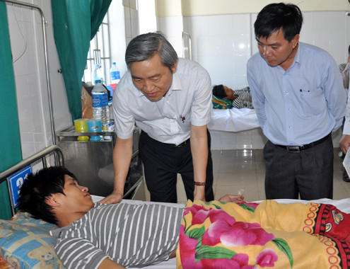 Phó chủ tịch UBND tỉnh Quảng Ngãi Lê Quang Thích cùng lãnh đạo Sở y tế thăm ngư dân gặp nạn vừa trở về từ Hoàng Sa. Ảnh:Trí Tín.