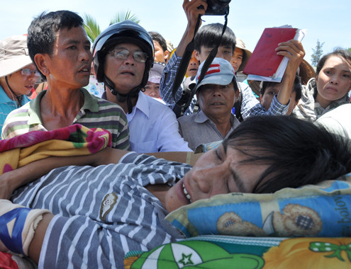 Thuyền trưởng Hải bị phía Trung Quốc đánh trọng thương được đưa từ tàu cá ở cảng Tịnh Kỳ lên xe cấp cứu trưa 18/5. Ảnh: Trí Tín.