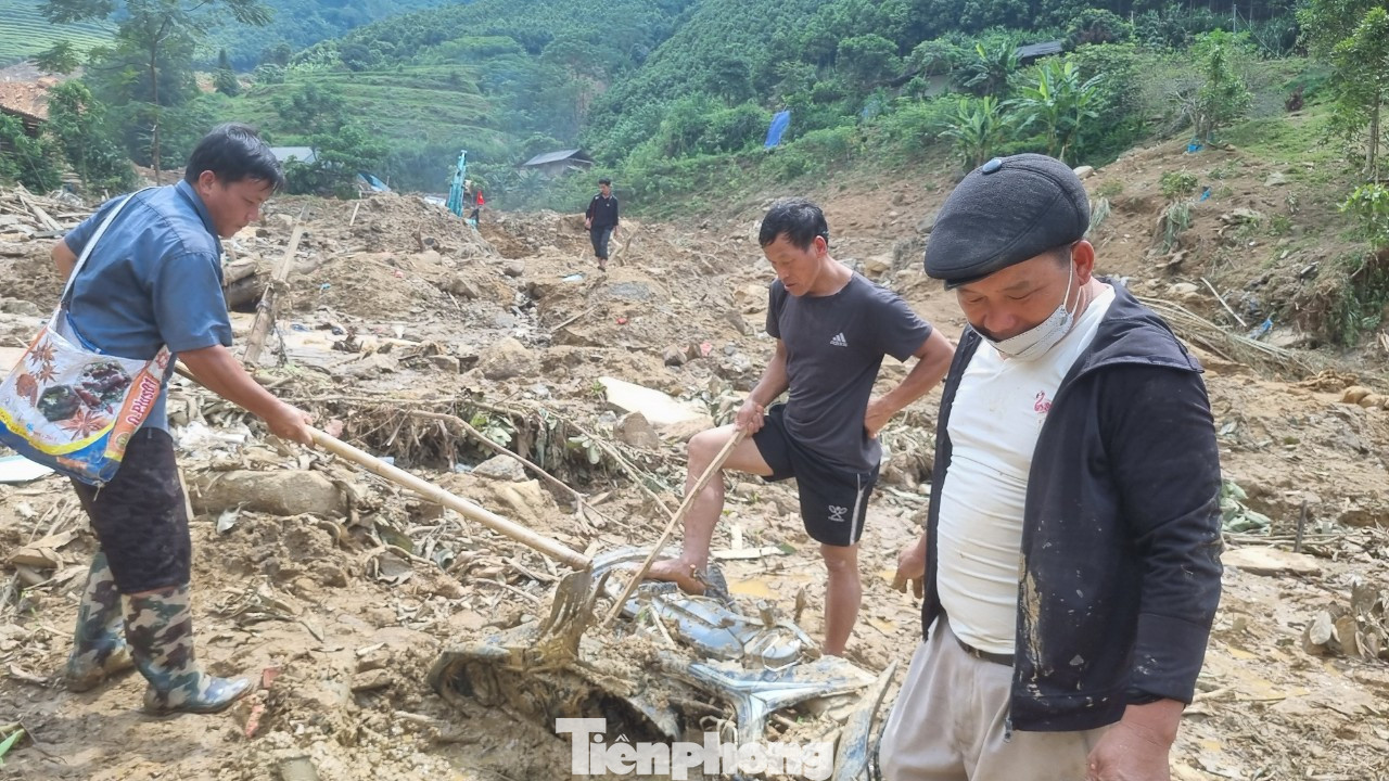 Anh Vũ cho biết, hôm đó, anh cùng một số họ hàng sang nhà anh trai bắt cá. Khi đang đứng giữa sân chia cá cho từng nhà, anh nghe tiếng ầm ầm từ trên cao. Ngước nhìn về phía thôn, một cột bùn đất như thác bất ngờ đổ ập xuống, cuốn trôi nhiều nhà cửa, trong đó có nhà của anh. Anh Vũ hoảng loạn chạy về, may mắn cứu được con của mình đang mắc kẹt ở bụi tre.