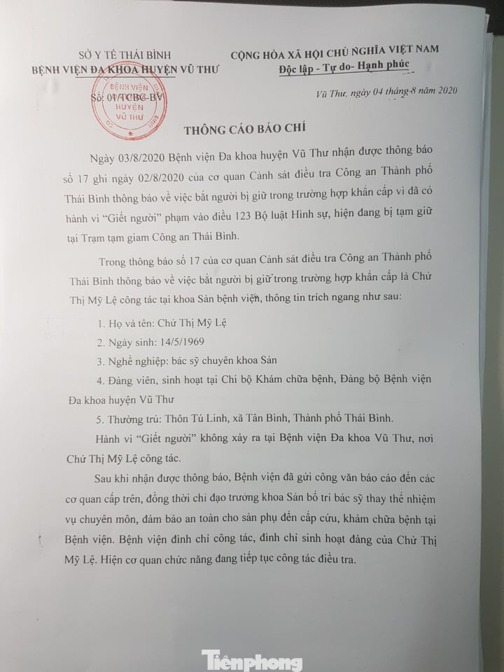 Bác sỹ Phạm Tín Trung - Giám đốc Bệnh viện cho biết ngày 3/8, bệnh viện nnhận được thông báo của Công an TP Thái Bình về việc đang tạm giữ hình sự bà Lệ để điều tra hành vi có dấu hiệu phạm tội "Giết người". Ngay sau đó, Bệnh viện Đa khoa huyện Vũ Thư đã có quyết định tạm đình chỉ công tác, sinh hoạt Đảng đối với bà Chử Thị Mỹ Lệ - Phó khoa Sản để phục vụ công tác điều tra của cơ quan công an.