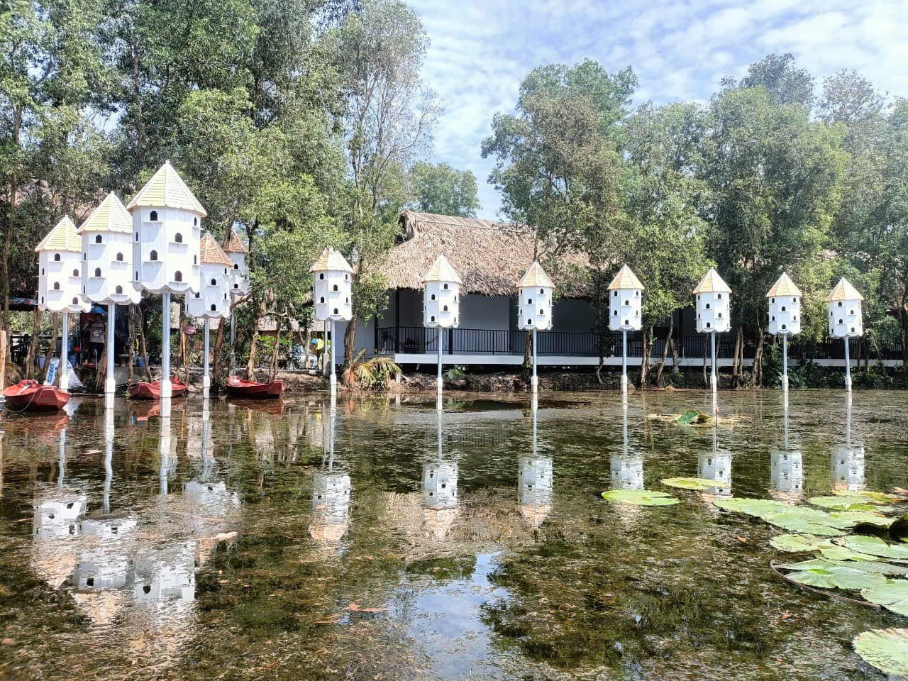 Khi ngồi trên thuyền tam bản lướt trên mặt nước đầy từ tốn từ ngoài bìa cho đến lõi trung tâm, du khách dễ dàng bắt gặp từng đàn chim trời bay lượn khắp nơi với phong cách an nhiên tự tại, không sợ hãi, vô cùng hiếu khách. Mỗi cá thể có một màu sắc đặc trưng riêng, là kiệt tác của thiên nhiên tạo hóa từ hình dáng bên ngoài cho đến bản chất bên trong, du khách sẽ được nghe hướng dẫn viên vừa chèo vừa nhẹ nhàng mô tả tỉ mỉ về thói quen của nhiều loài thiên điểu; từ cò trắng, diệc, le le thường thấy cho đến giang sen hiếm có khó tìm.