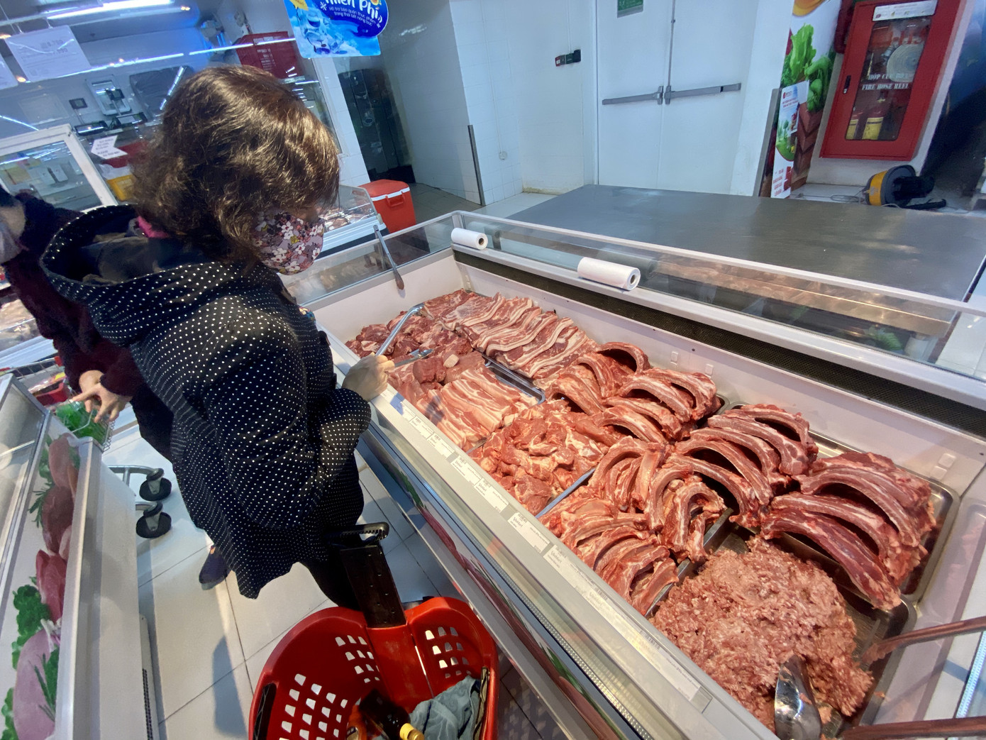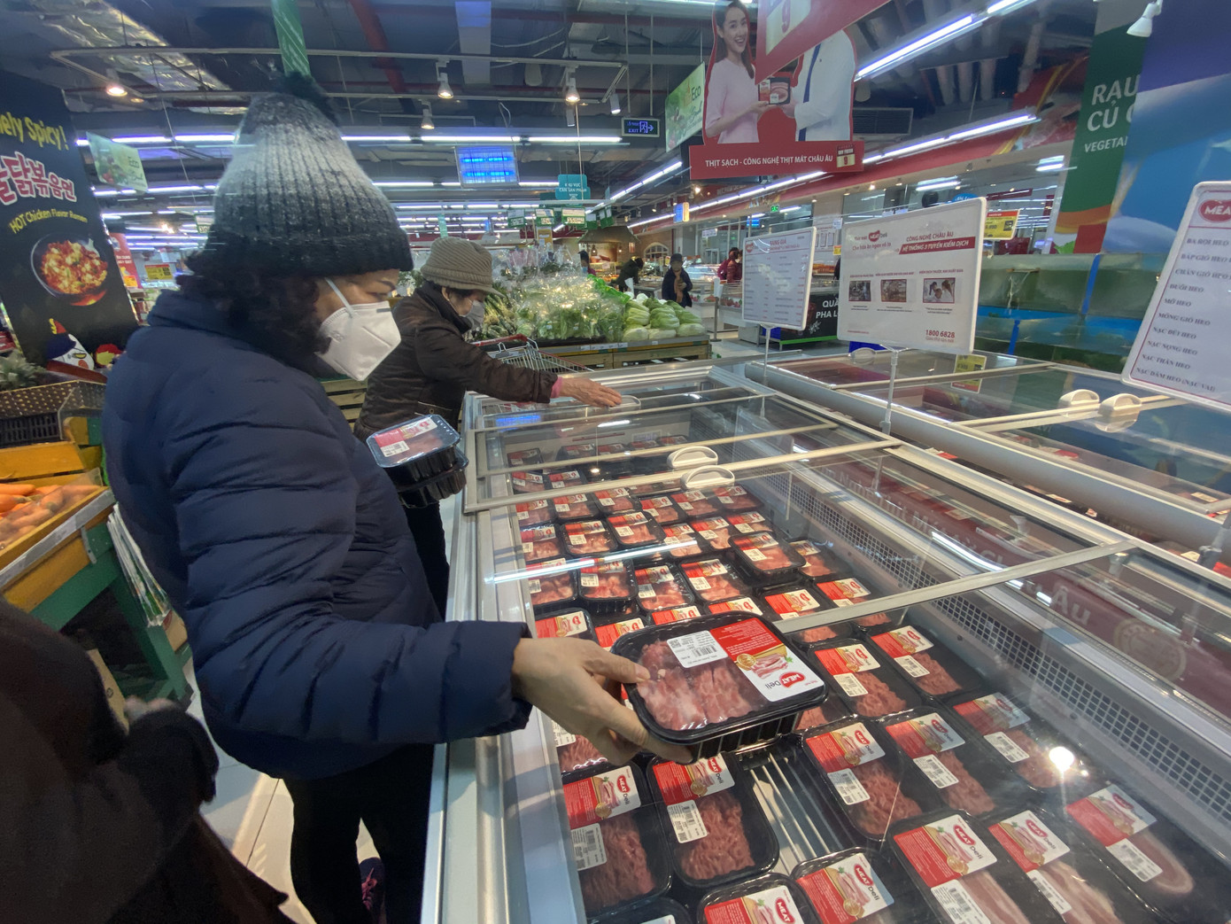 Sườn sụn non là loại đắt nhất trên quầy thịt siêu thị Vinmart, giá 231.900 đồng/kg. Trong buổi sáng 17/2, nhiều bà nội trợ tranh thủ đến siêu thị ngay giờ mở cửa để chọn mua được thực phẩm ưng ý