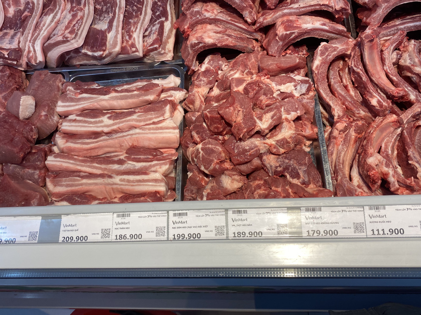 Tương tự, Ba chỉ heo tại Vinmart cũng thấp hơn 30.000 đồng so với thịt của Meat Deli. 209.900 đồng/kg là mức giá siêu thị này niêm yết suốt 1 tuần qua đối với ba chỉ heo, các loại thịt khác giữ ổn định