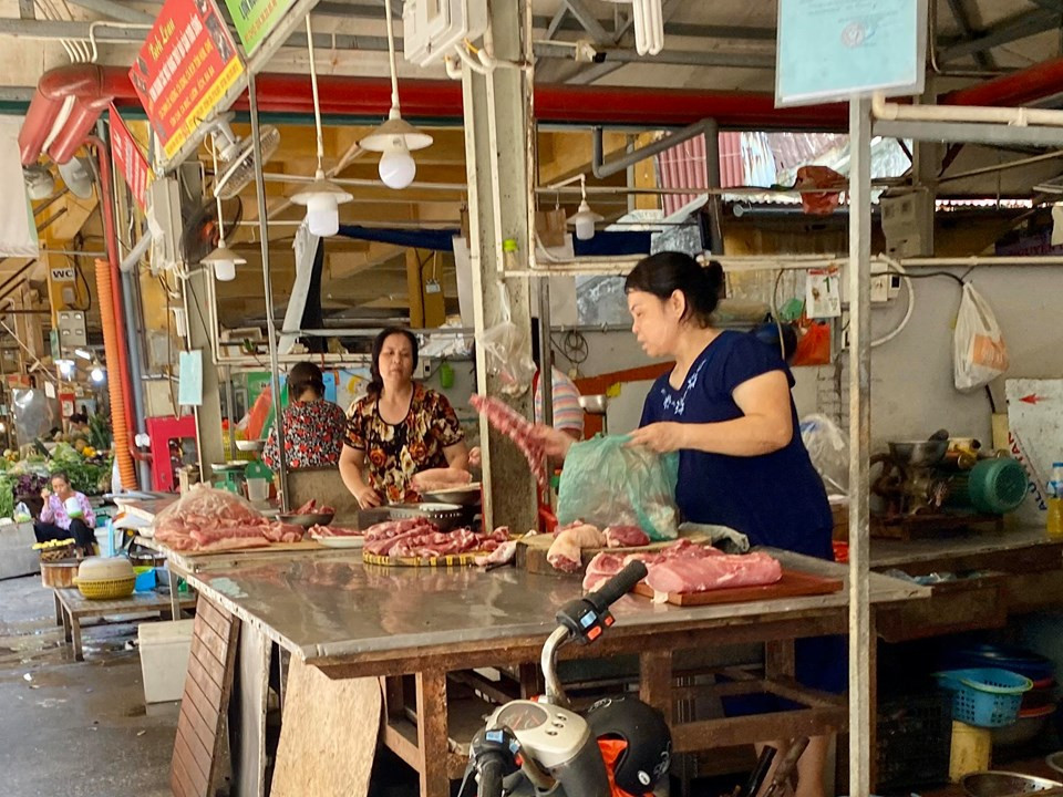 Chị Minh Hằng, tiểu thương bán thịt tại ngõ chợ Lương Đình Của (Đống Đa, Hà Nội) cho biết, giá lợn hơi có giảm nhưng giảm không đáng kể nên tiểu thương chưa thể giám giá thịt lợn ngay. Cách đây 3 ngày, mỗi ngày, giá nhập thịt lợn tăng lên vài nghìn/kg lợn hơi nay chỉ giảm 1.000- 2.000 đồng/kg nên giá bán đến tay người tiêu dùng vẫn cao. "Chúng tôi buôn bán không thích bán cao vì bán cao người mua càng ít đi nhưng giá không giảm mạnh nên thịt lợn tại chợ vẫn đứng giá", chị Hằng nói.