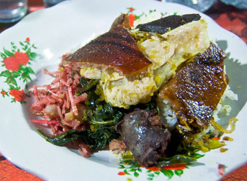 Nếu cảm thấy đĩa cơm chưa đủ, bạn có thể gọi thêm porsi sosis (xúc xích heo) và pepes otak babi (thịt lợn thái nhỏ trộn cùng hỗn hợp gia vị ớt, sả, cà ri, me, húng quế và nhiều loại khác, rồi bọc trong lá chuối nướng), dồi tiết. Ảnh: Balimanual.