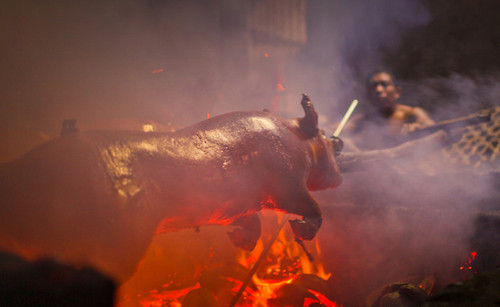 Thời gian nướng từ 3 đến 4 tiếng. Lợn quay trên lửa phải được xoay liên tục, đều tay để lớp bì giòn đều. Mùi gỗ và vỏ dừa thơm sẽ quyện vào thịt mang đến hương vị đặc trưng khó quên. Ảnh: CNN.
