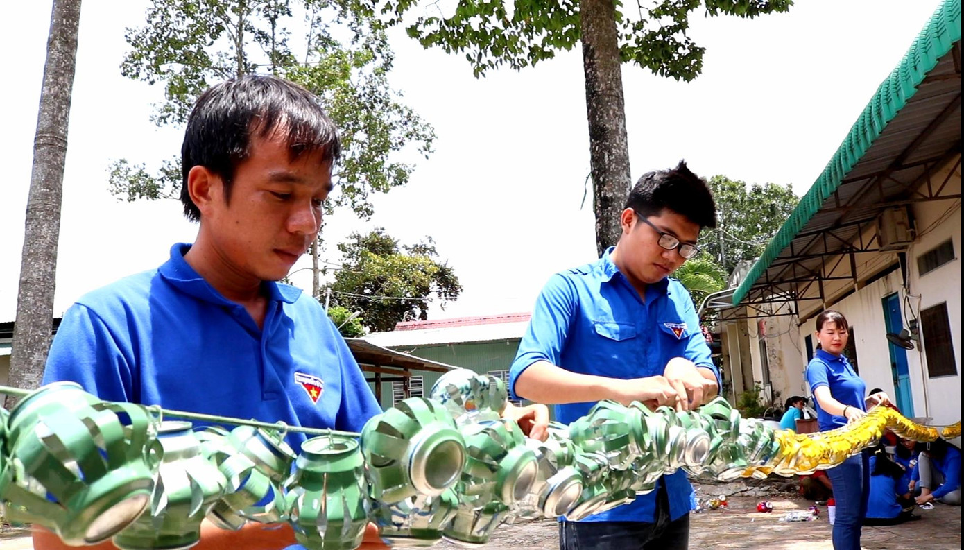 Đoàn viên thanh niên xã đoàn Bình Long, huyện Châu Phú, tỉnh An Giang thực hiện làm lồng đèn từ phế liệu tặng trẻ em vùng sâu - Ảnh: Kim Hà. Anh Nguyễn Phi Khanh (thành viên tham gia thực hiện) chia sẻ: “Đa số các trẻ em bây giờ sử dụng các loại lồng đèn điện tử, nhựa,… rất đắt tiền, mà qua mùa Trung thu rồi các em không chơi nữa. Trong khi đó, ở các vùng sâu, trẻ em không có điều kiện vui trung thu còn rất nhiều. Vì vậy, chúng tôi đã tái chế lại những chiếc lon bia đã sử dụng qua rồi để làm 1 chiếc lồng đèn mang đến món quà ý nghĩa, thiết thực cho các em thiếu nhi”.
