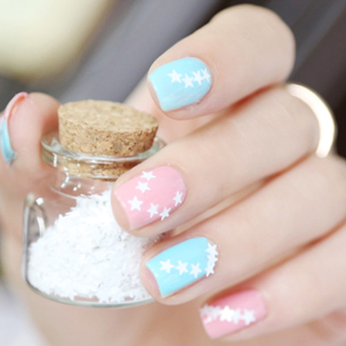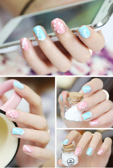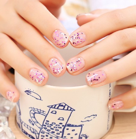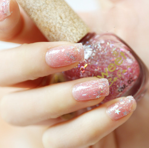 - Đầu tiên bạn sơn hai lớp sơn lót cho móng. Bạn nên chọn màu sơn và màu kim tuyến có sự nổi bật nhưng vẫn hòa hợp với nhau. Ví dụ như gam màu tím hồng này đi với những hạt kim tuyến màu xanh bạc rất tuyệt vời. Nhưng quan trọng nhất là màu sơn nền phải hợp với màu da của bạn.
