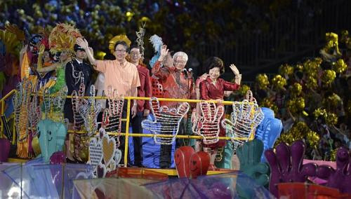 Thủ tướng Lý Hiển Long (người mặc áo đỏ) cùng phu nhân vẫy tay chào mọi người