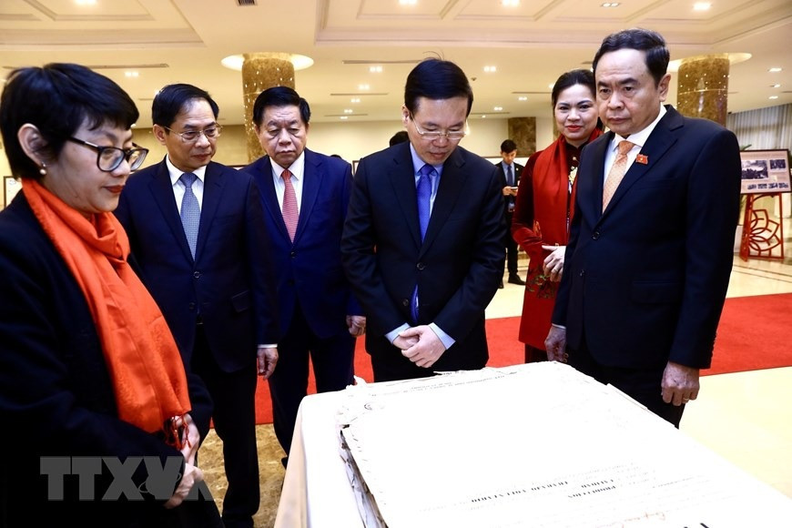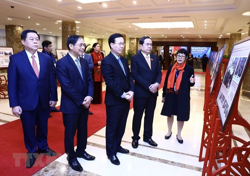 | Thường trực Ban Bí thư Võ Văn Thưởng và Phó Chủ tịch Thường trực Quốc hội Trần Thanh Mẫn cùng các đại biểu tham quan trưng bày tư liệu và hình ảnh lịch sử tại lễ kỷ niệm. (Ảnh: Lâm Khánh/TTXVN) |