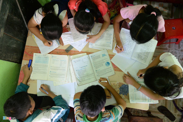 Những ngày cuối tuần, lớp đông học sinh hơn. Mỗi độ tuổi, các em được xếp ngồi với nhau để cô giáo tiện giảng dạy và cũng để các em trao đổi bài vở.