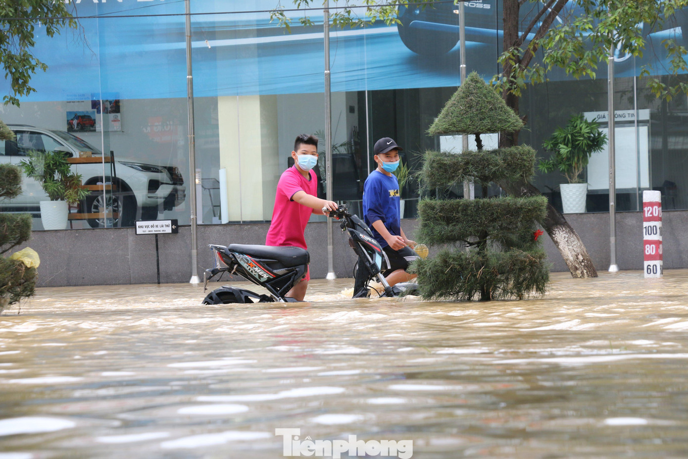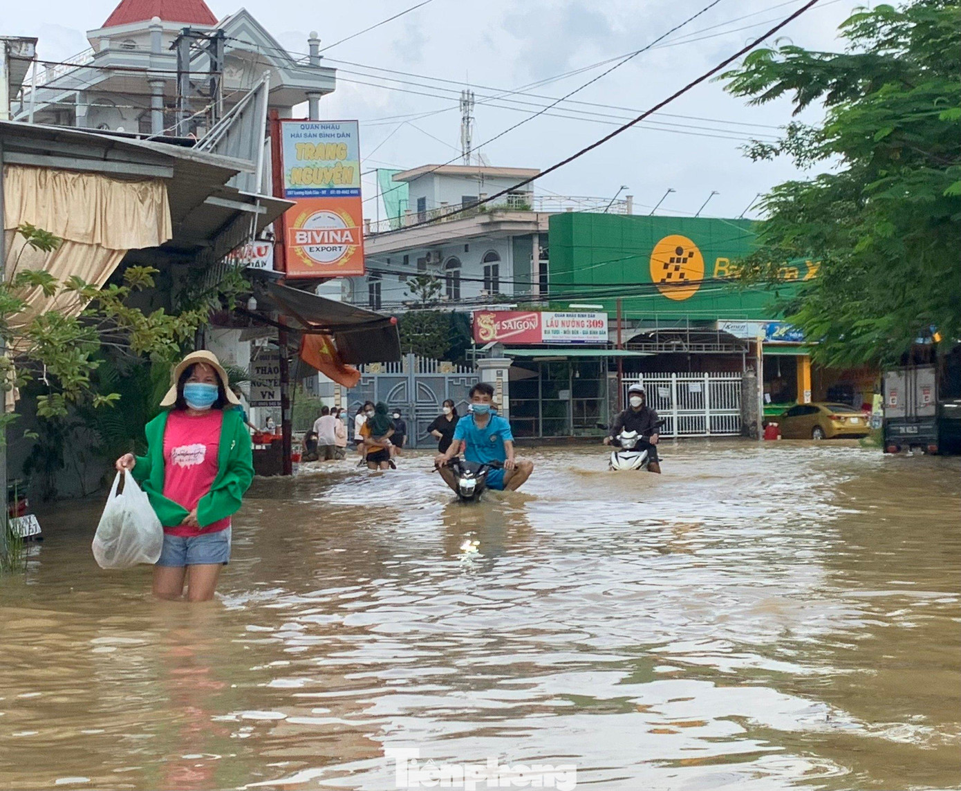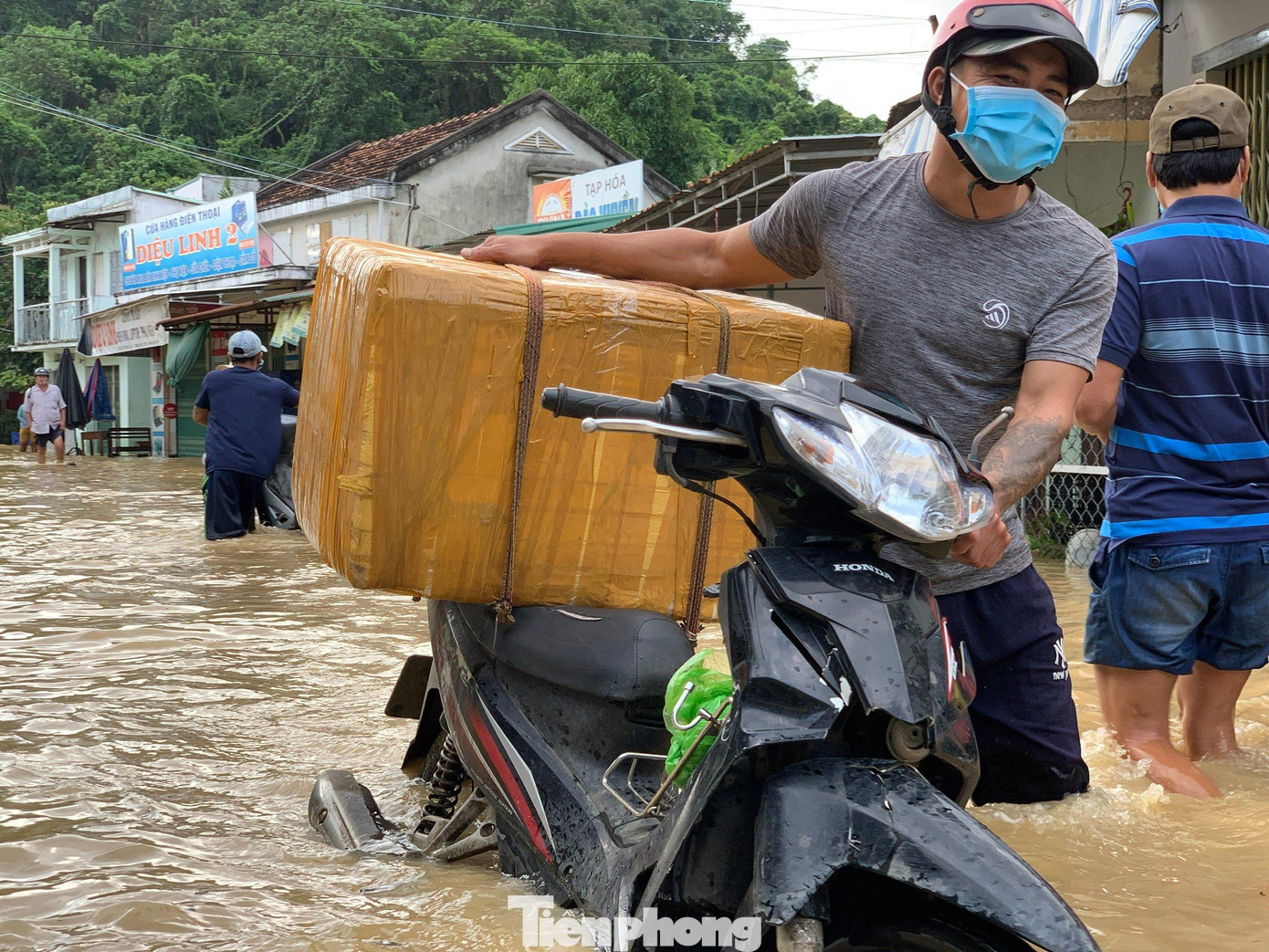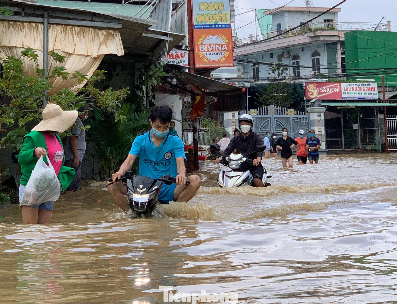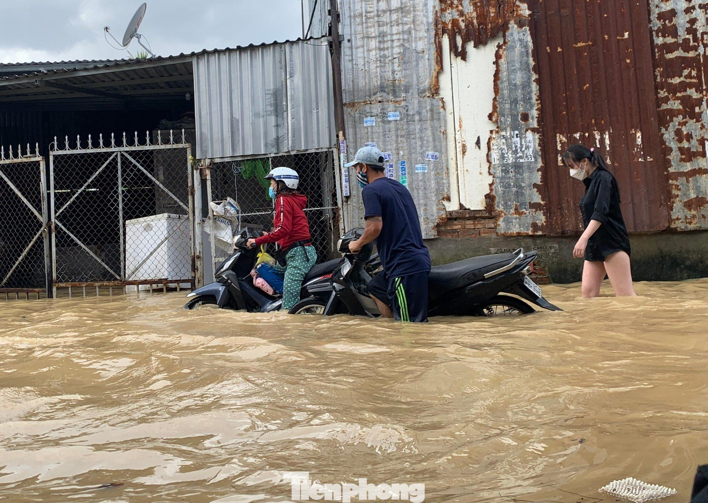 | Dân Nha Trang dắt xe máy lội "bì bõm" trong nước lũ sáng nay |