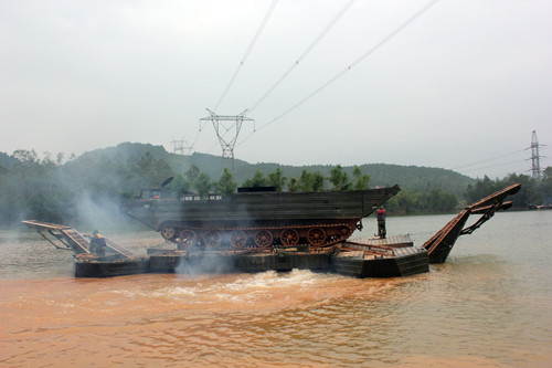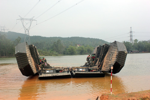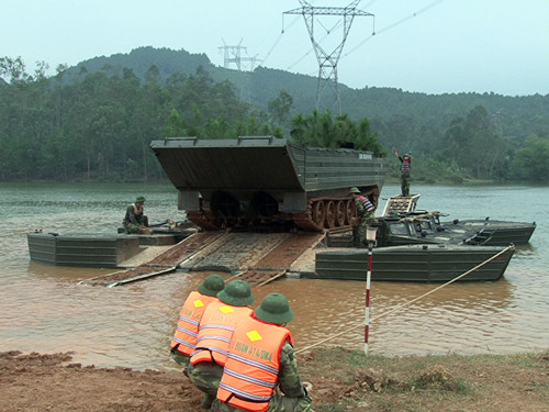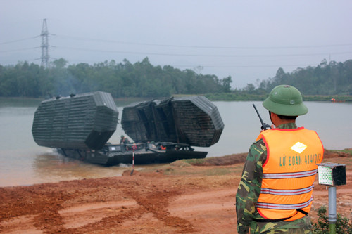 | Đại đội Công binh tự hành 8 – Tiểu đoàn Vượt sông 27 thực hành thực binh “Đảm bảo vượt sông bằng phà GSP và PTS” trong diễn tập. |