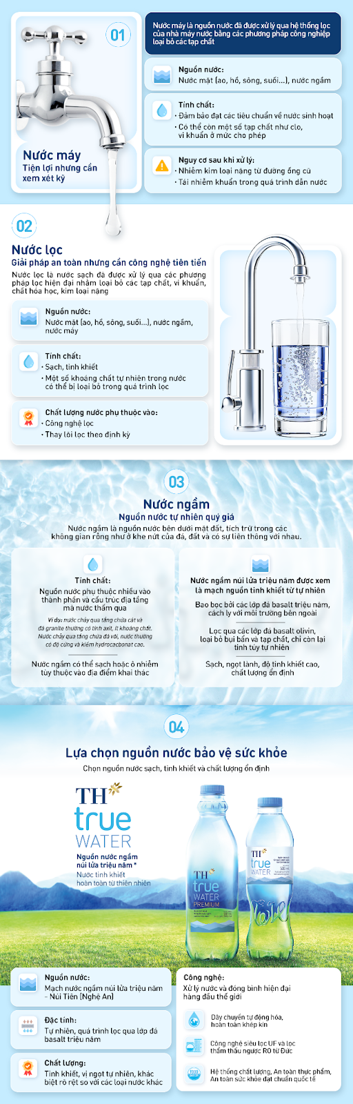 Khi nhu cầu chăm sóc sức khỏe ngày càng cao, việc sử dụng nguồn nước sạch và đảm bảo chất lượng ổn định đã trở thành mối quan tâm hàng đầu của nhiều gia đình. Tuy nhiên, với sự đa dạng của các nguồn nước hiện nay, mỗi loại đều có những ưu điểm và hạn chế riêng, khiến người tiêu dùng thêm phân vân trong việc lựa chọn. Vậy giữa nước máy, nước lọc thông thường và nước ngầm tự nhiên, đâu mới là nguồn nước thực sự tinh khiết và an toàn cho sức khỏe?