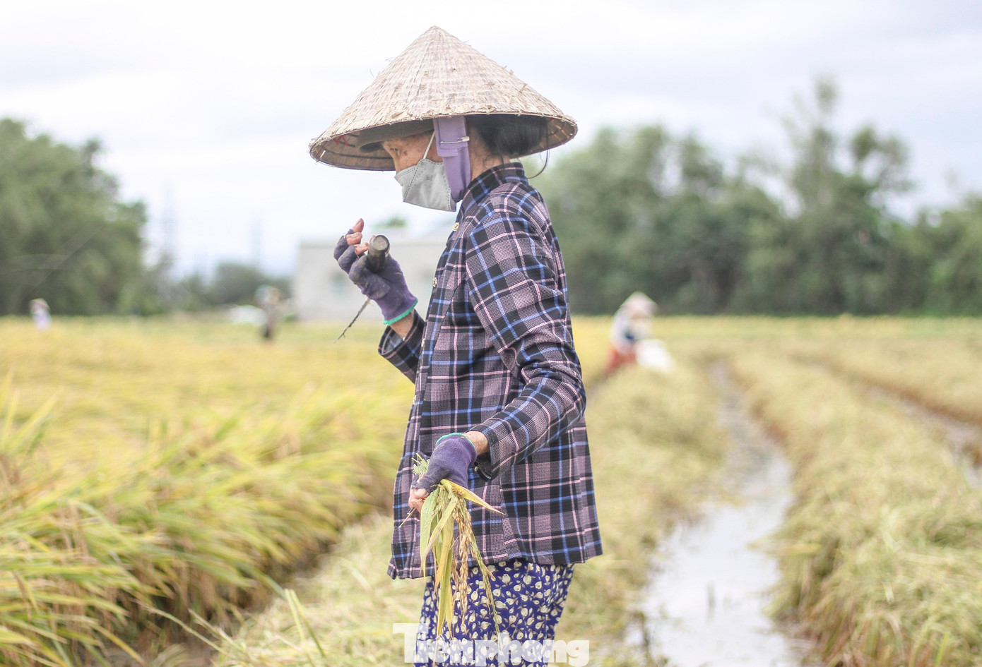 | “Đáng lẽ lúa cắt sớm chứ chín hết rồi nhưng bữa giờ mưa quá nên không cắt được. Mọi năm đâu có như thế này. Giờ lúa ngã, nằm sát ruộng máy có cắt cũng sót nhiều, rồi chạy dậm xuống lấm bùn đất, rụng hết. Giờ cũng phải bỏ công ra dùng liềm để phụ vớt những chỗ ngã đổ nặng”, bà Hạnh chia sẻ. Ảnh: Trương Định |