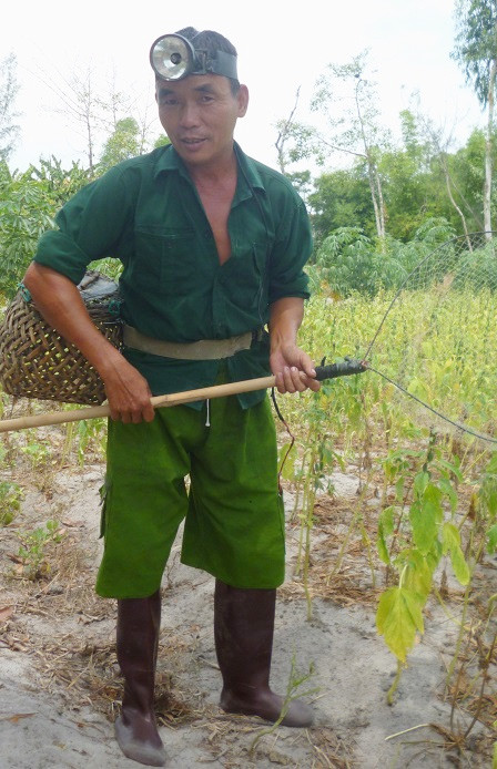 Đồ nghề đơn giản chỉ gồm một cây sào trúc dài chừng 5-6m có gắn vợt lưới, một bình ắc quy gắn với đèn pin đội đầu, một giỏ tre đựng ếch, chỉ cần trang bị chừng ấy cộng thêm đôi chân dẻo dai và cặp mắt tinh tường là cánh thợ soi đã có thể lên đường.