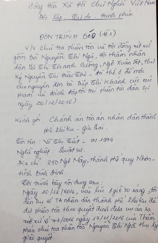 Ngày 26/12, luật sư Võ Thị Tiết (Đoàn luật sư tỉnh Bình Định) cho biết đã gửi đơn tố cáo đến các cơ quan chức năng về việc nguyên đơn D.T.K.C (trú tại TP. Pleiku, Gia Lai) cùng một nhóm đối tượng hành hung bà ngay tại phòng xét xử của Tòa án nhân dân thành phố Pleiku.