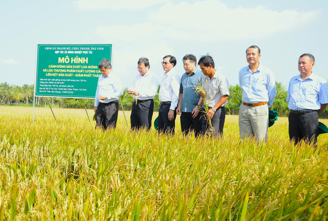 | Lãnh đạo Bộ NN&PTNT và tỉnh Trà Vinh khảo sát mô hình sản xuất lúa hữu cơ, chất lượng cao giảm phát thải ở huyện Châu Thành, tỉnh Trà Vinh. |