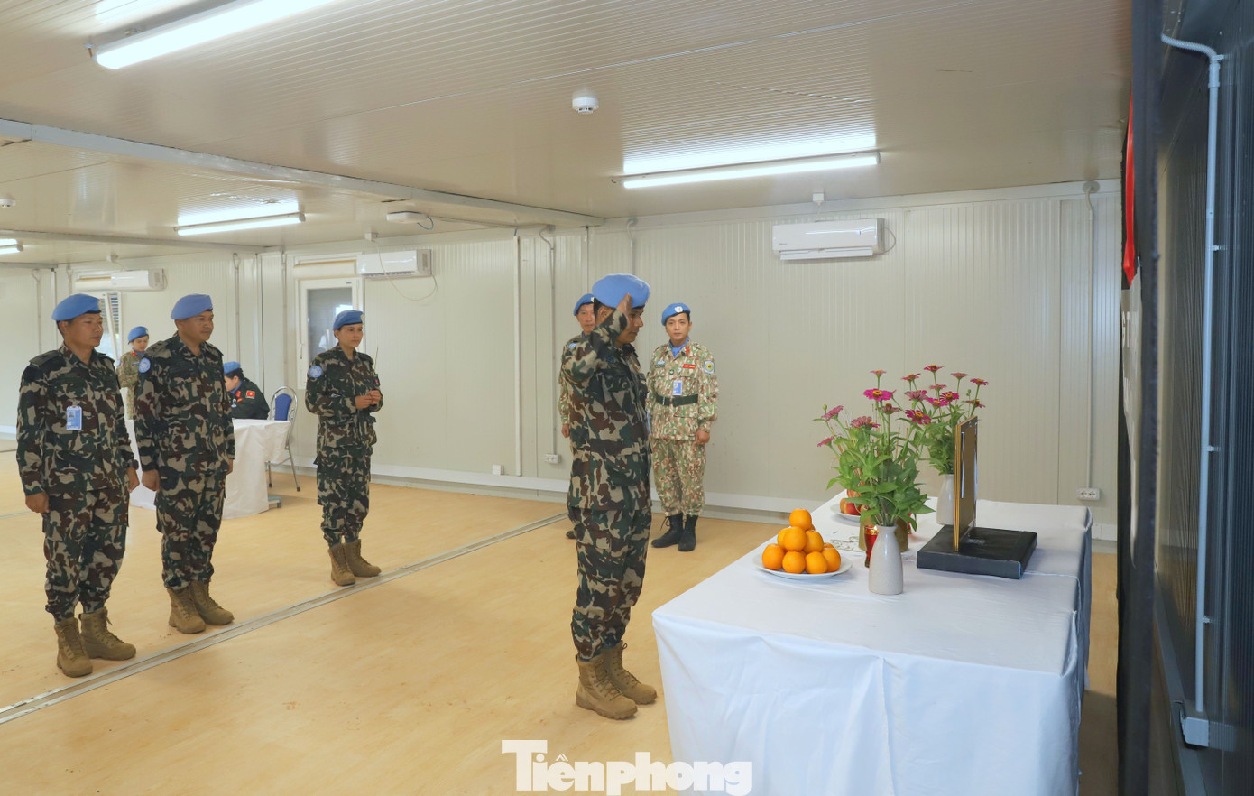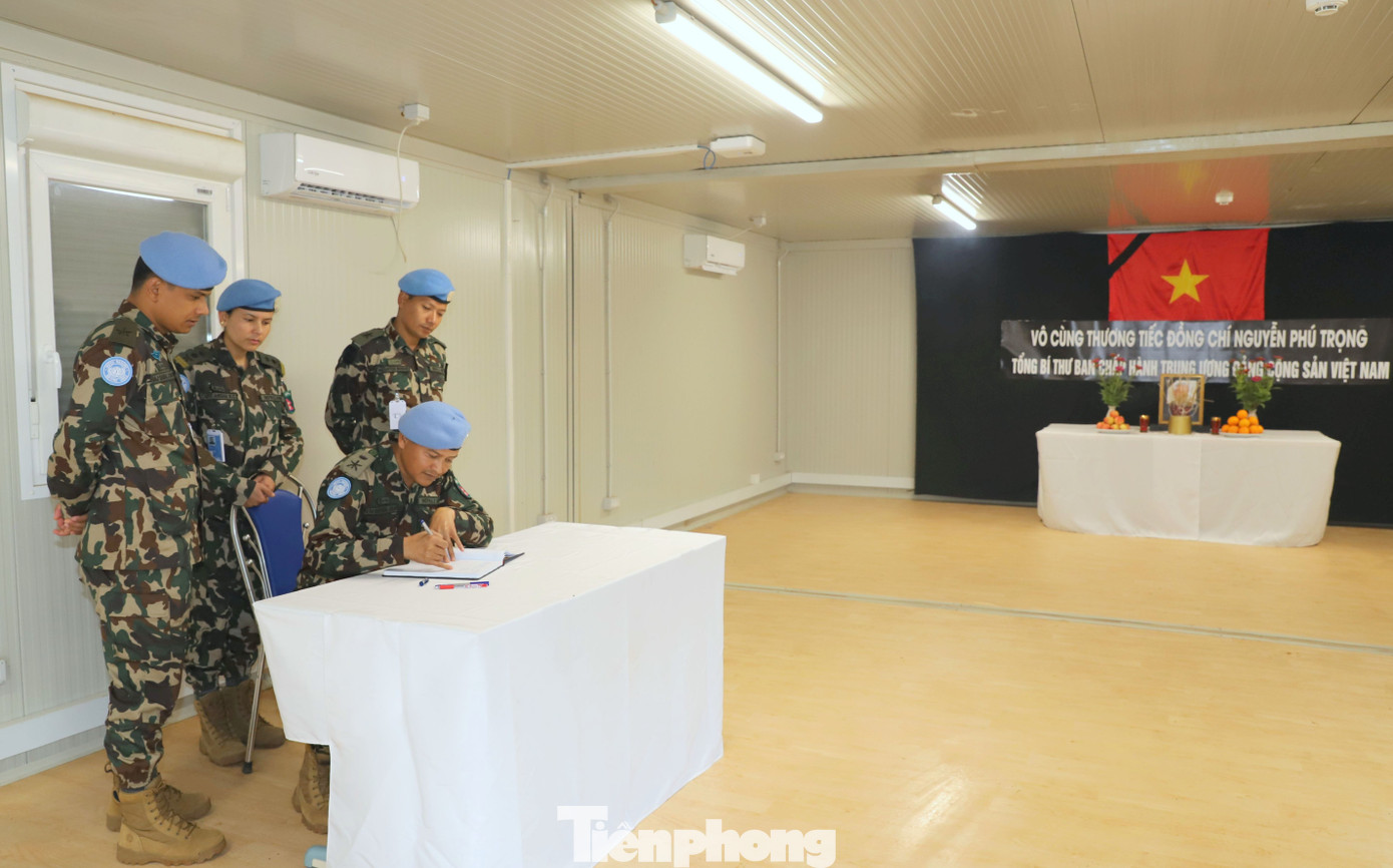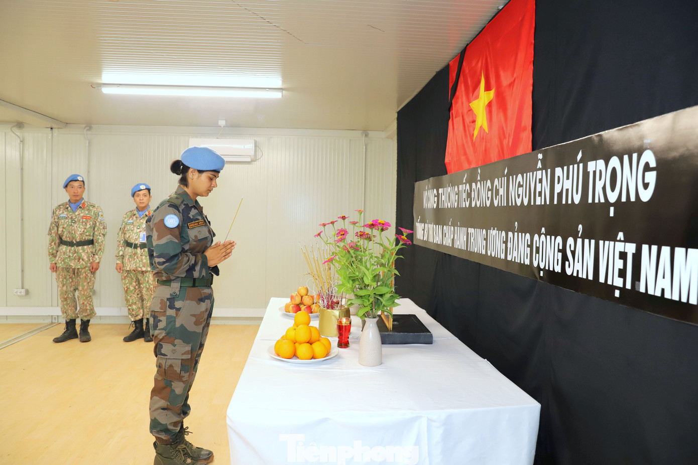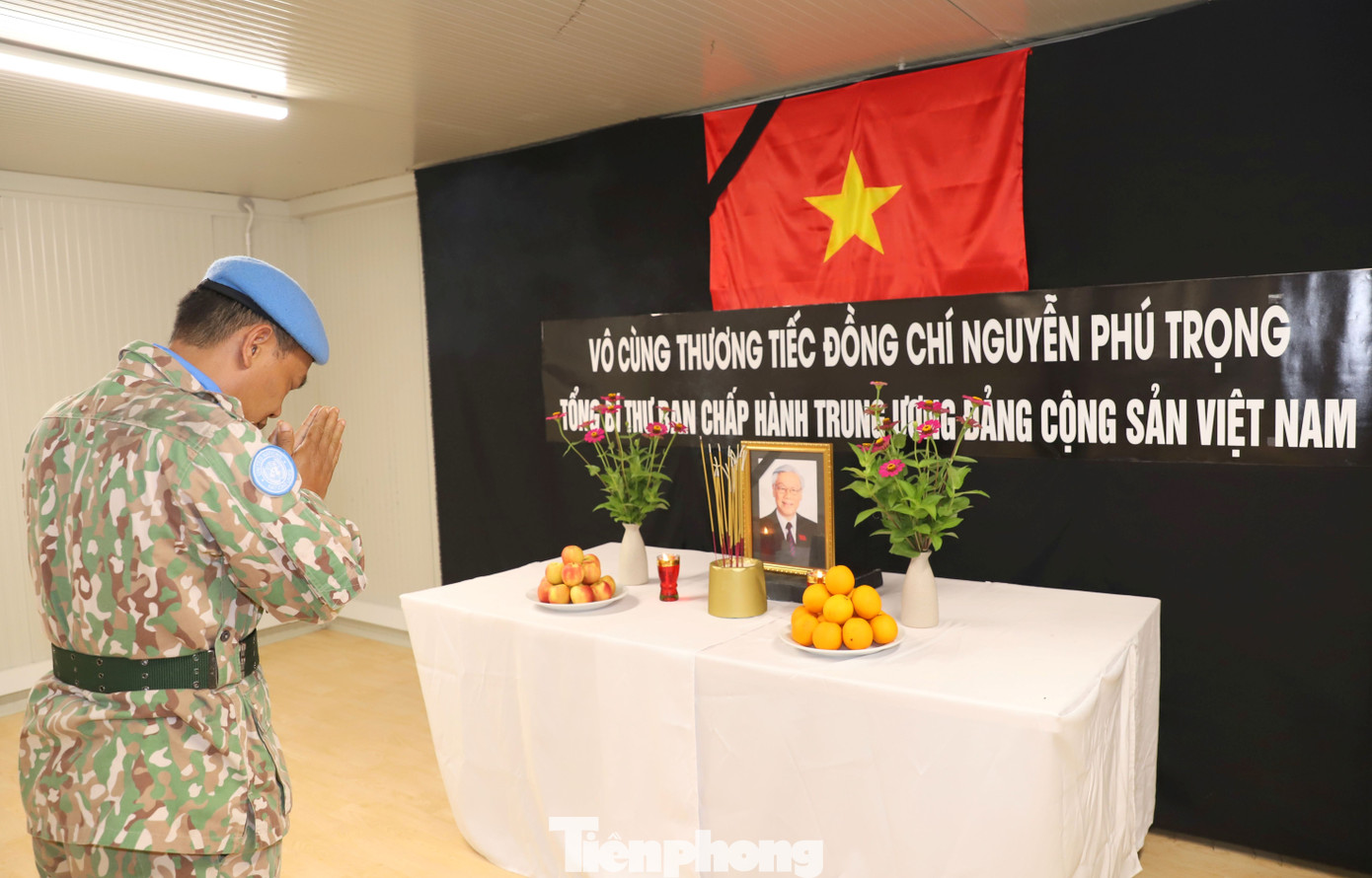 Hình ảnh Lực lượng Gìn giữ hòa bình Việt Nam tại Phái bộ UNISFA và đồng nghiệp quốc tế tưởng nhớ và tiễn biệt Tổng Bí thư Nguyễn Phú Trọng, trong lễ viếng được tổ chức ở căn cứ Highway.