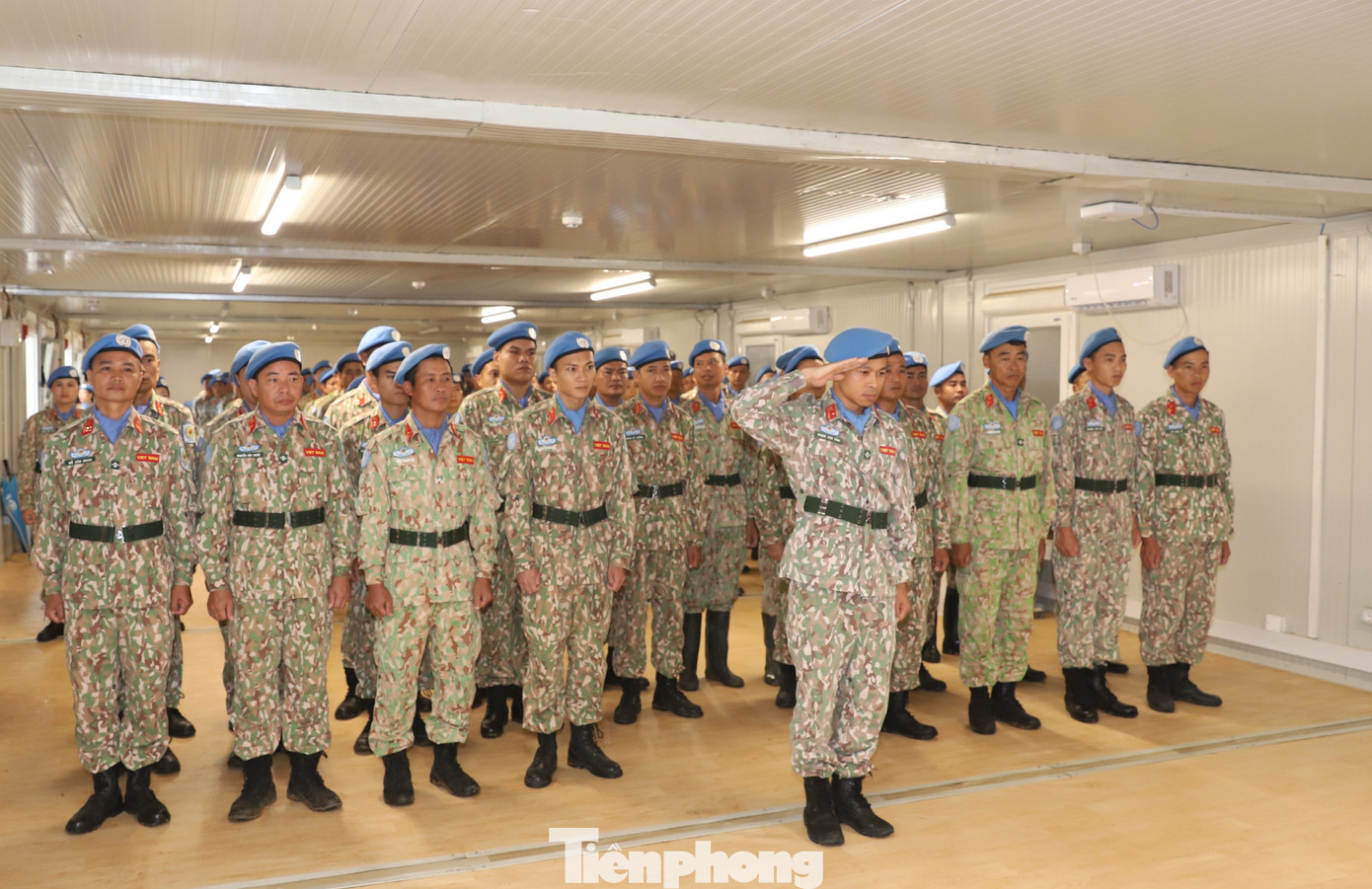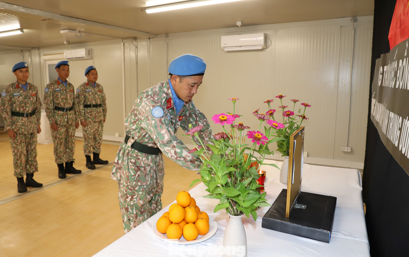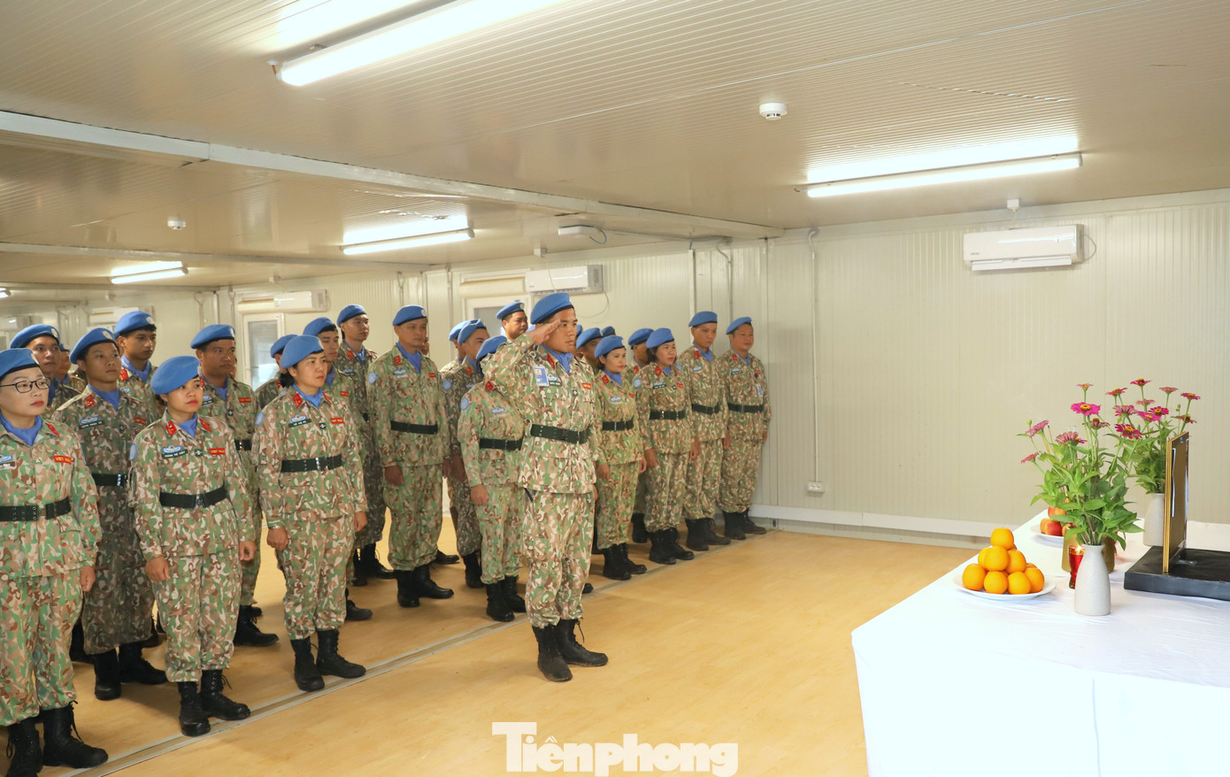 Hình ảnh Lực lượng Gìn giữ hòa bình Việt Nam tại Phái bộ UNISFA và đồng nghiệp quốc tế tưởng nhớ và tiễn biệt Tổng Bí thư Nguyễn Phú Trọng, trong lễ viếng được tổ chức ở căn cứ Highway.
