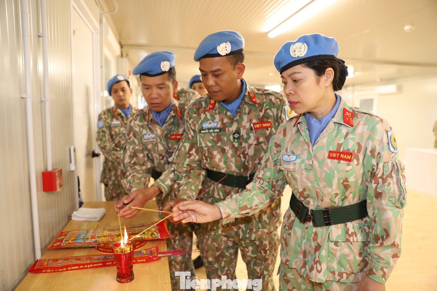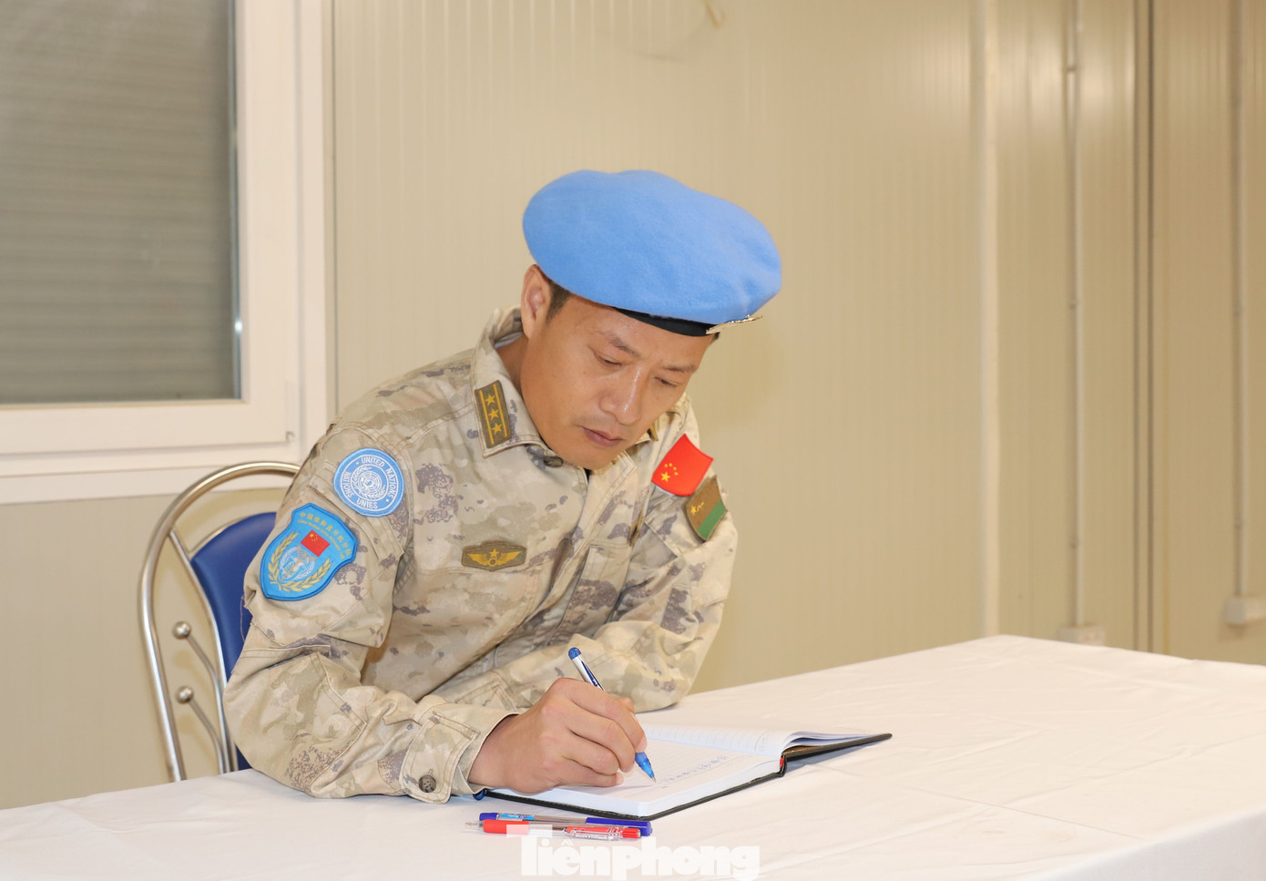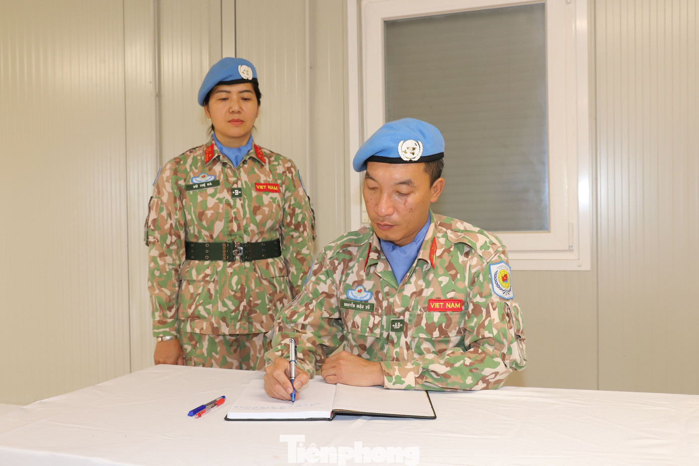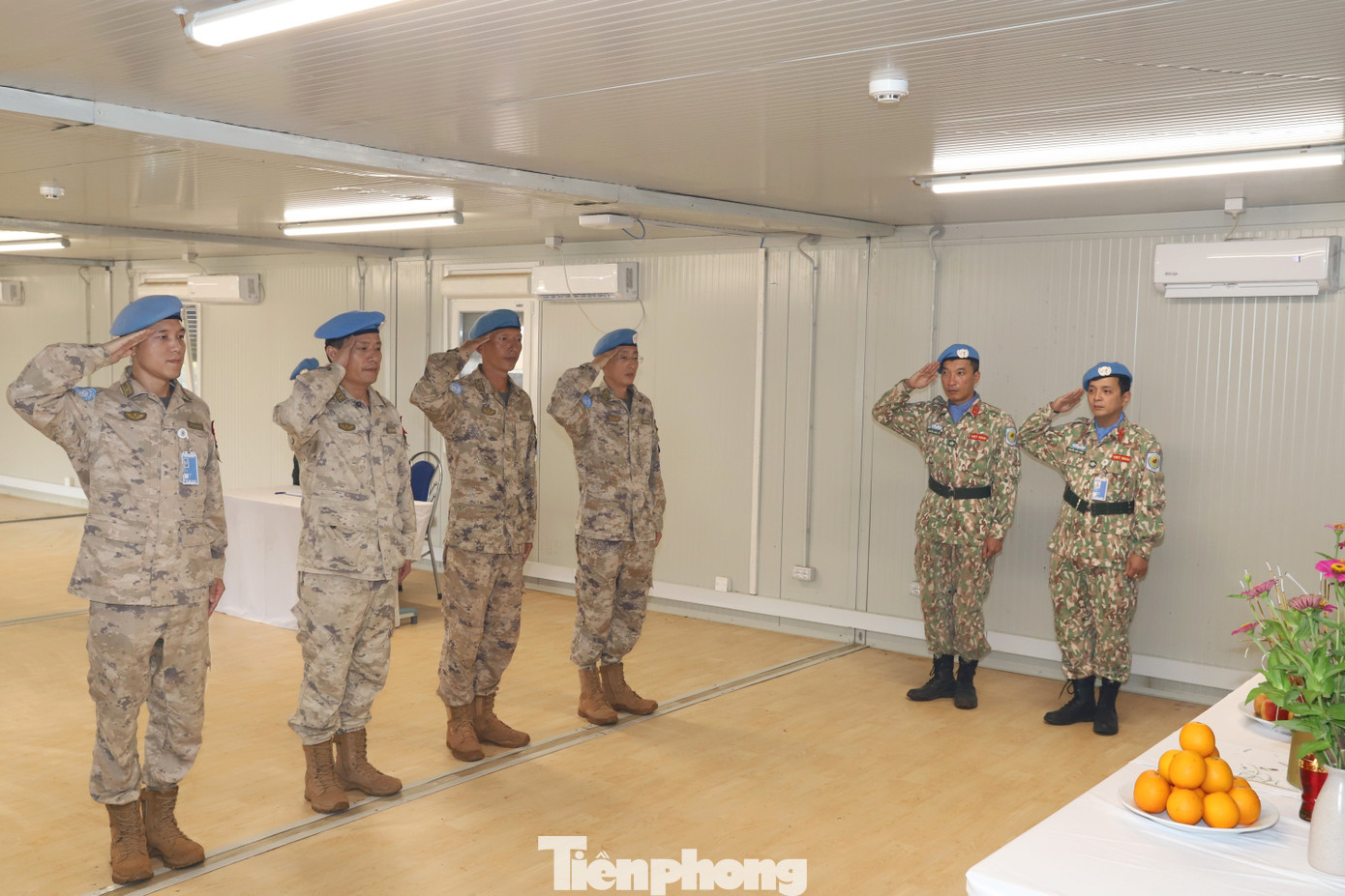Hình ảnh Lực lượng Gìn giữ hòa bình Việt Nam tại Phái bộ UNISFA và đồng nghiệp quốc tế tưởng nhớ và tiễn biệt Tổng Bí thư Nguyễn Phú Trọng, trong lễ viếng được tổ chức ở căn cứ Highway.