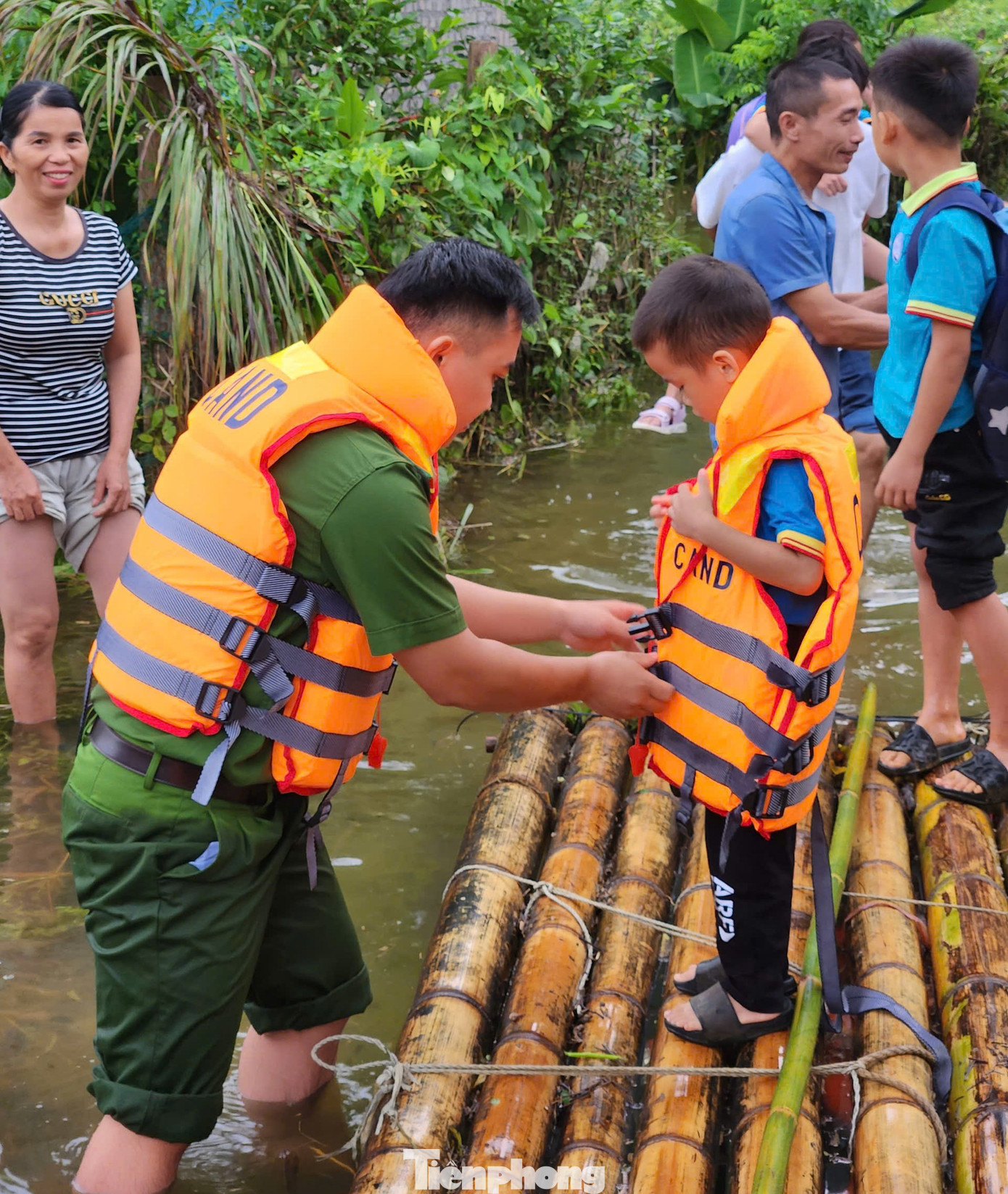 | Hình ảnh cán bộ, chiến sỹ Công an huyện Bắc Sơn (Lạng Sơn) đưa thầy cô và các trẻ nhỏ vượt lũ đến trường học. |