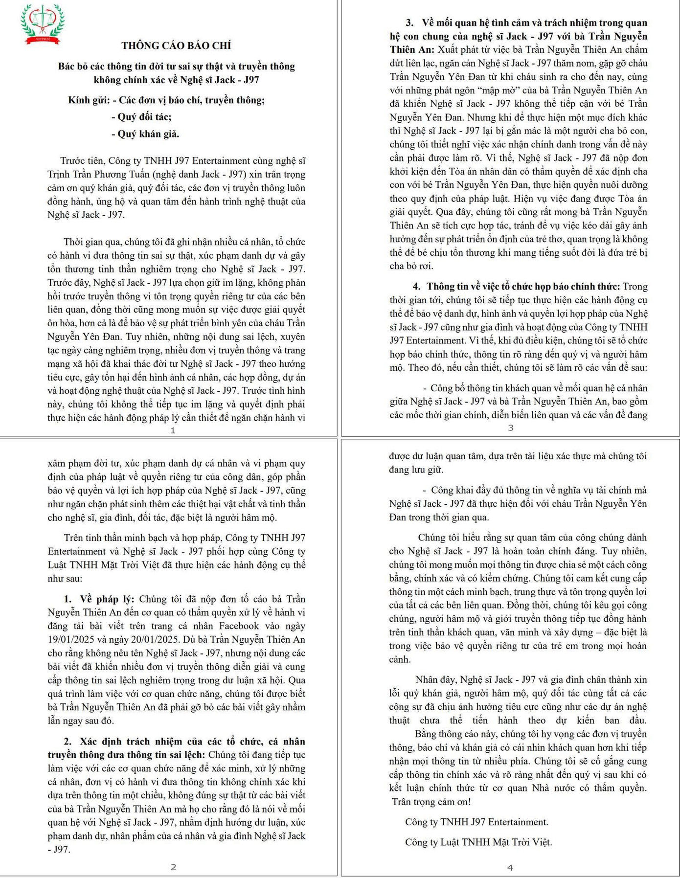 Đúng lúc công chúng tưởng rằng câu chuyện đã lắng xuống, ngày 26/5 vừa qua, công ty J97 Entertainment (đại diện của Jack) tung ra Thông cáo báo chí, cho biết nam ca sĩ đã chính thức nộp đơn tố cáo Thiên An lên cơ quan có thẩm quyền với lý do đăng tải 2 bài viết trên Facebook thời điểm cuối tháng 1/2025 với nội dung khiến nhiều đơn vị truyền thông diễn giải và cung cấp thông tin sai lệch nghiêm trọng trong dư luận xã hội.