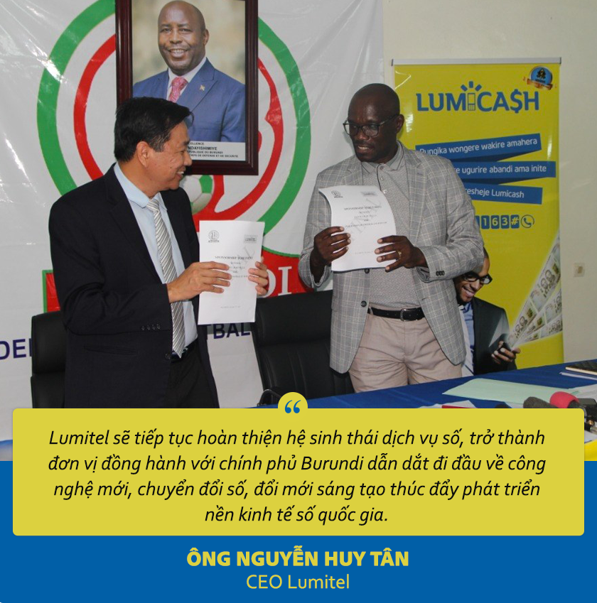 CEO Nguyễn Huy Tân: Đóng góp dễ nhìn thấy nhất là dịch vụ thanh toán số thông qua ví điện tử. Hiện nay khi đi ra khỏi nhà, phần lớn người dân có thu nhập sẽ mang theo chiếc điện thoại di động sử dụng dịch vụ của Lumitel để giữ liên lạc và ví điện tử Lumicash. Đó là niềm tự hào và thành công của chúng tôi.