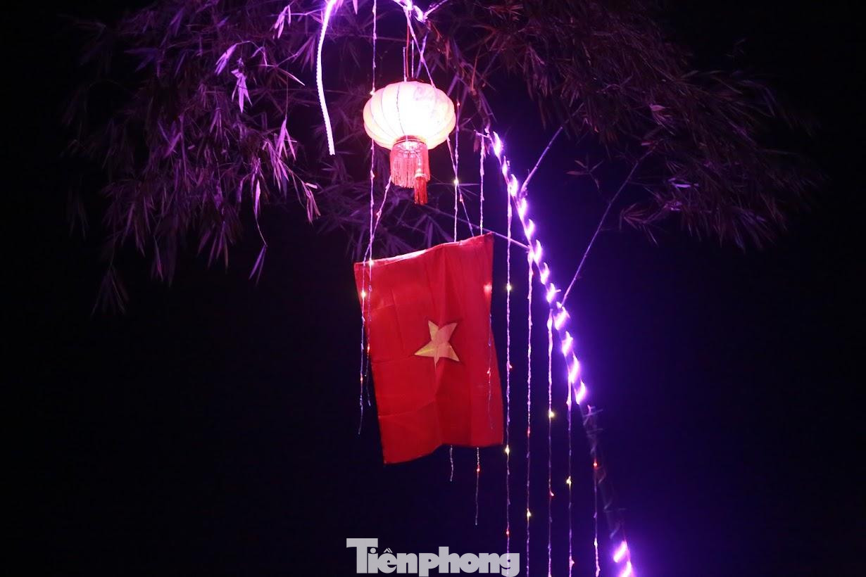 | Cây nêu truyền thống được dựng bằng thân cây tre, phía trên được trang trí dây led, đèn màu, đèn lồng thêm phần rực rỡ trong đêm. |